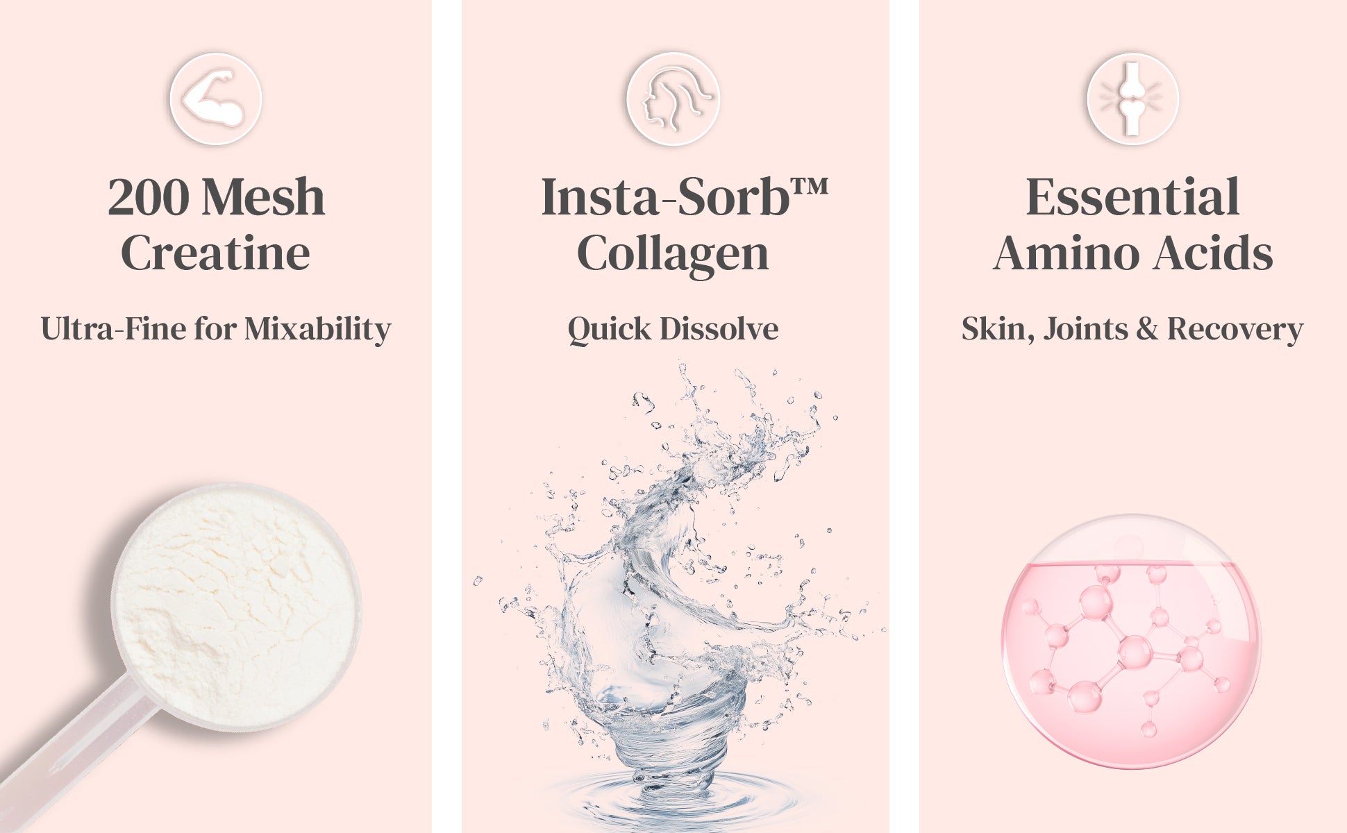 Premium Absorption: Micronized 200 mesh creatine monohydrate + Insta-Sorb™ collagen peptides for faster mixability and better uptake.